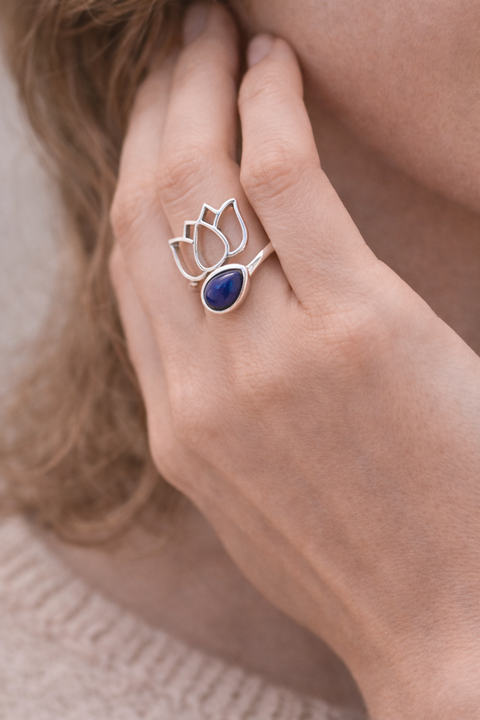 El anillo Loto Lápiz-Lazuli en plata 925 es una creación que combina sabiduría, verdad y elevación espiritual. Su piedra azul profundo lo convierte en un joyal a la vez poderoso y refinado, ideal para acompañar al portador en su búsqueda de claridad mental, expresión auténtica y equilibrio interior.