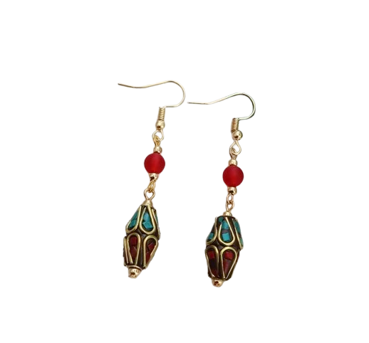 Pago seguro SSLLos pendientes Éclat Tibetano son una oda al arte artesanal nepalí y a las tradiciones espirituales del Himalaya. Fabricados en latón dorado, están adornados con incrustaciones de turquesa y coral reconstituido, dos materiales emblemáticos de la cultura tibetana.