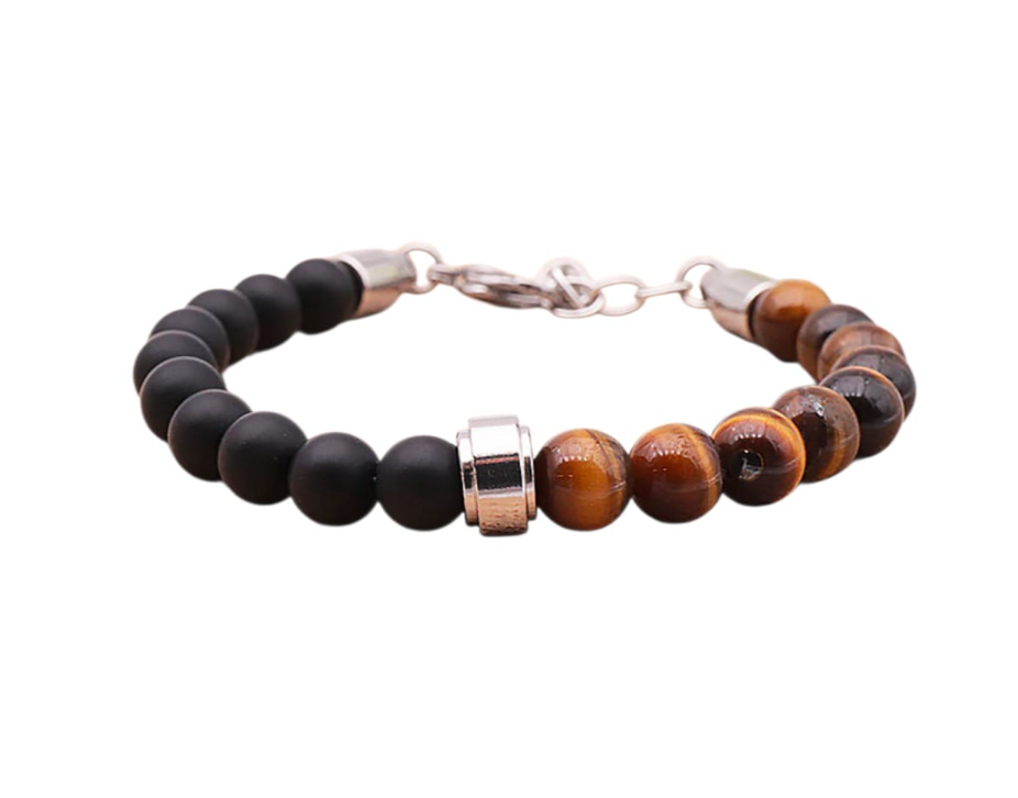 Los reflejos dorados y marrones del ojo de tigre contrastan armoniosamente con la profundidad sobria del óxido, creando una joya poderosa y equilibrada. Con sus perlas de 8 mm y un cierre seguro, esta pulsera ofrece una presencia marcada en la muñeca, al tiempo que conserva una elegancia atemporal.