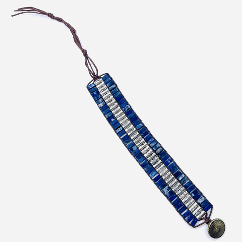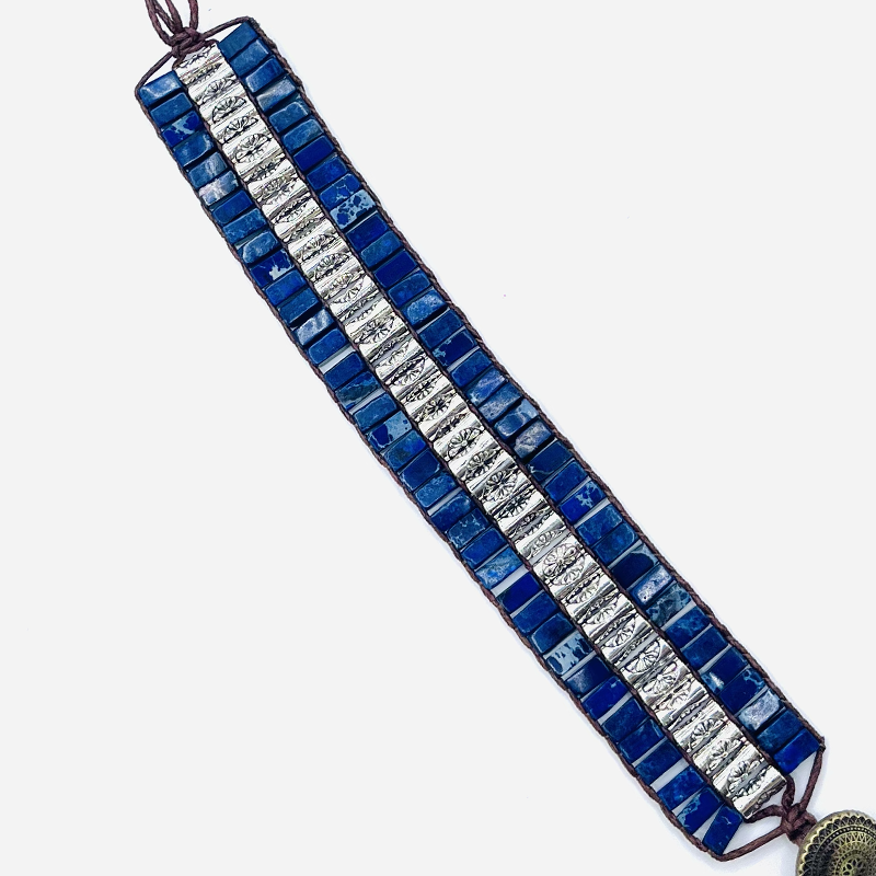 - Materiales: piedras naturales de sodalita, metal de plata grabado, correa de cuero genuino