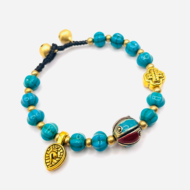 La cuerda trenzada y los cascabeles: la protección y el anclaje espiritual Utilizada durante siglos en las pulseras de oración tibetanas, la cuerda trenzada simboliza la unión entre el cuerpo, el alma y la mente. Los cascabeles dorados, por su parte, alejan las energías negativas y aportan un toque de luz y armonía.