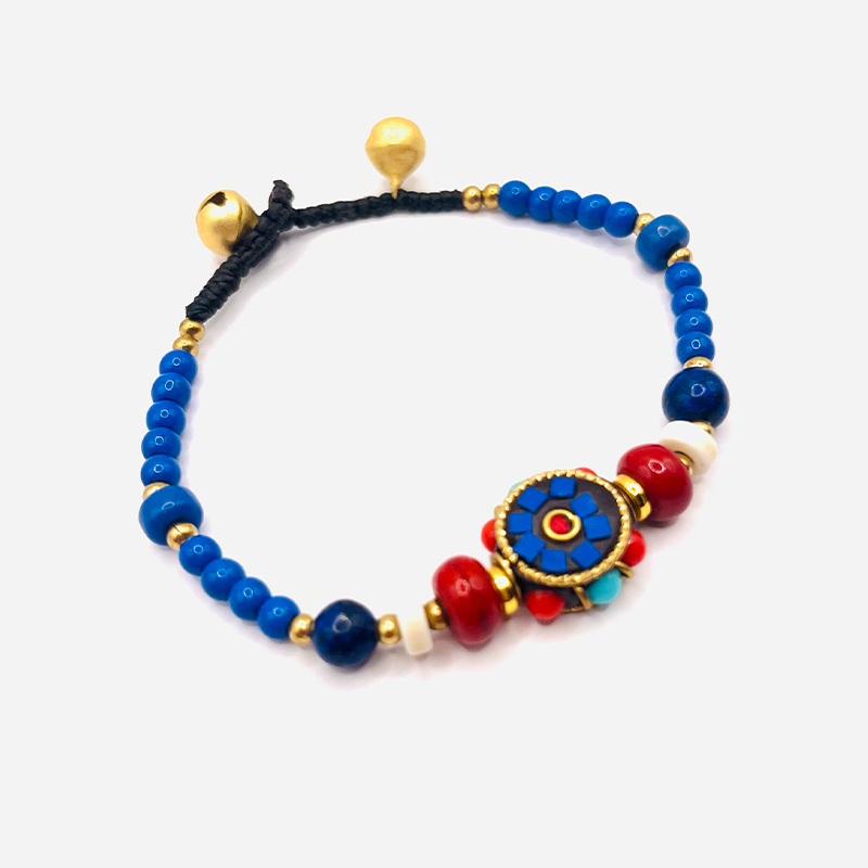 En su centro se encuentra un talisman de loto adornado con mosaicos azules y rojos, que recuerdan a los mandalas tibetanos y a las enseñanzas del Buda. Su cierre ajustable, adornado con pequeñas campanitas doradas, evoca el tintineo de los templos tibetanos, fomentando la meditación y la atención plena.