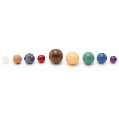 Présentées dans un élégant coffret en bois avec intérieur mousse protectrice et fermoir en métal, ces sphères aux diamètres progressifs (de 10 à 25 mm) évoquent un alignement cosmique.