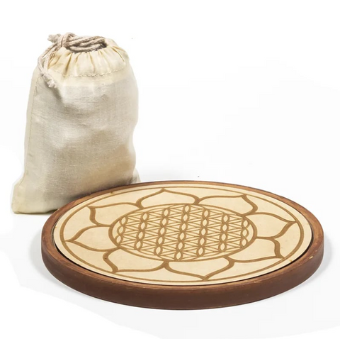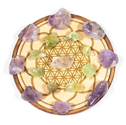 La Flor de Vida, base de esta grilla, es un símbolo sagrado que representa la armonía universal y la estructura energética fundamental del mundo. La disposición de los cristales sigue un alineamiento preciso para dirigir y concentrar la energía hacia la intención de curación.