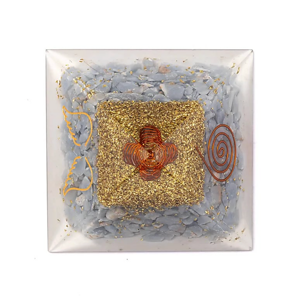 Paiement Sécurisé SSLLa pyramide Ailes Célestes est une orgonite d’une rare douceur énergétique, qui associe l’angélite, pierre de sérénité et de communication spirituelle, au symbole sacré des ailes d’ange, messagères de protection et de guidance. Véritable canal de lumière, elle invite à l’apaisement, à l’ouverture du cœur et au lien subtil avec les plans supérieurs. Placée dans votre espace de vie ou utilisée en méditation, elle diffuse une énergie pure et réconfortante.