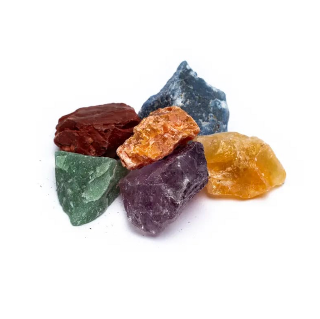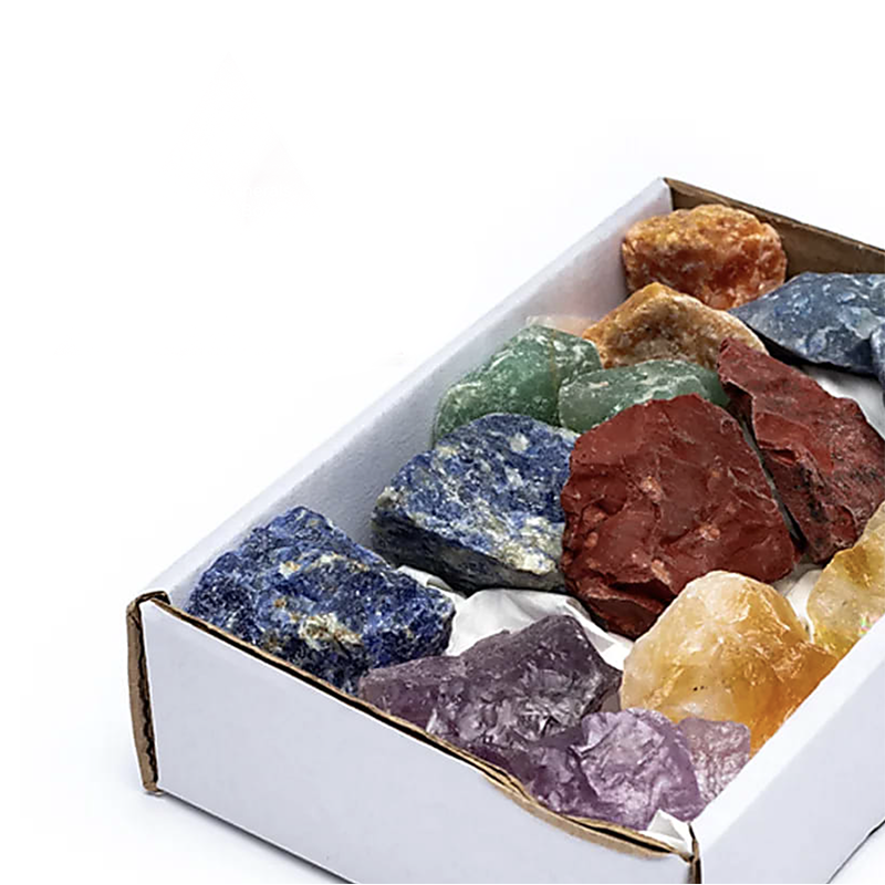 * **Sodalita** – Chakra del tercer ojo: intuición, claridad mental * **Cuarzo azul** – Chakra de la garganta: comunicación, verdad * **Calcita naranja** – Chakra sacro: vitalidad, creatividad * **Citrino** _(amatista calentada)_ – Chakra del plexo solar: confianza, energía * **Cuarzo verde** – Chakra del corazón: amor, curación emocional * **Jaspe rojo** – Chakra raíz: anclaje, seguridadNota: Cada caja es única. Las piedras siendo naturales, sus formas, colores y dimensiones pueden variar de la imagen.